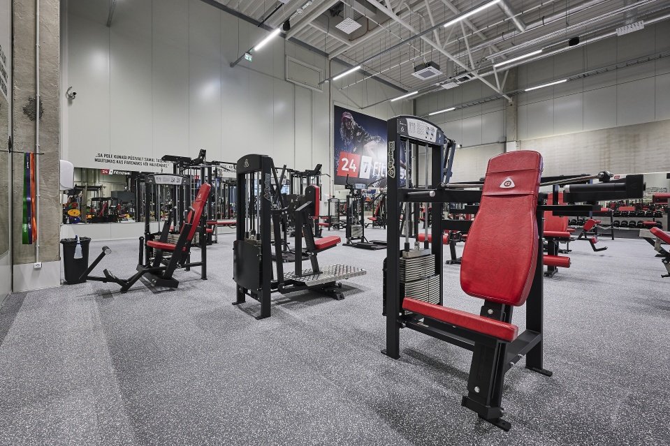 Всего 12 беговых матов Technogym, 2 SkillMill беговых матов, 10 велосипедов Gymtec, 8 кросстрейнеров Gymtec, 22 блок-тренажеров Gymleco и 30 тренажеров со свободным грузом Gymleco, 1 профессиональная скамья для пресса, платформа для поднятия тяжестей, 4 гребных тренажера C2, 1 SkiErg, YoYo Leg Curl http://www.nhance.ee/reie-2/, 1 Technogym Stairmaster
